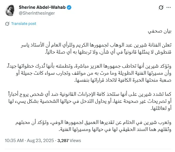 أصدرت النجمة شيرين عبد الوهاب بيانًا رسميًا كشفت فيه عن إنهاء علاقتها بمحاميها السابق ياسر قنطوش، مؤكدة أنه لم يعد يمثلها قانونيًا في أي شأن، ولا تربطها به أي صلة في الوقت الحالي. شيرين توضح موقفها القانوني وجاء في البيان أن شيرين تخاطب جمهورها مباشرة، مطمئنة إياهم بأنها تُدرك خطواتها جيدًا، وأن ما مرت به من تجارب ومواقف في حياتها الفنية والشخصية، سواء كانت صعبة أو جميلة، أكسبها خبرة كبيرة لاتخاذ قراراتها بنفسها. بيان شيرين عبد الوهاب تحذير شيرين لمروجي الشائعات وشددت الفنانة على أنها ستلجأ إلى كافة الإجراءات القانونية ضد أي شخص يروج أخبارًا كاذبة أو تصريحات غير صحيحة عنها، أو يحاول التدخل في حياتها الخاصة بشكل يسيء إليها أو إلى أسرتها. رسالة شيرين لجمهورها وفي ختام بيانها، أعربت شيرين عبد الوهاب عن تقديرها العميق لجمهورها الوفي، مؤكدة أن محبتهم وثقتهم هما الداعم الحقيقي لها في حياتها ومسيرتها الفنية. اختفاء مفاجئ وأزمة صحية الفترة الماضية شهدت ابتعاد شيرين عبد الوهاب عن أصدقائها المقربين وحتى عن الوسط الفني، حيث أغلقت هاتفها وتوقفت عن الظهور الإعلامي، تسربت أنباء وقتها عن مرورها بأزمة صحية ونفسية دفعتها لتأجيل حفلاتها ومشاريعها الفنية التي كانت قد بدأت التحضير لها. شيرين عبد الوهاب وفي ظل هذه الظروف، استعانت شيرين بمدير أعمال جديد لإدارة شؤونها الفنية، لكن العلاقة بينهما تحولت سريعًا إلى خلافات حادة بعدما حاول فرض سيطرة كاملة على حياتها، ومع اشتداد أزمتها، تدخل أصدقاؤها في محاولة لدعمها وإنقاذها، إلا أن ظهورها المفاجئ في مهرجان “موازين” بالمغرب أثار صدمة جديدة، بعدما دخلت في أزمة علنية تصدرت عناوين الصحف. إجراءات قانونية وتصعيد متبادل لاحقًا، قررت شيرين الاستغناء عن مدير أعمالها وبدأت اتخاذ خطوات قانونية ضده، في حين بادر هو الآخر بإجراءات مضادة وصلت إلى ساحات القضاء، وبينما كانت تلك القضايا محل نزاع، تجدد التواصل بينها وبين حسام حبيب، الذي ظل لسنوات قريبة منها رغم خلافاتهما.